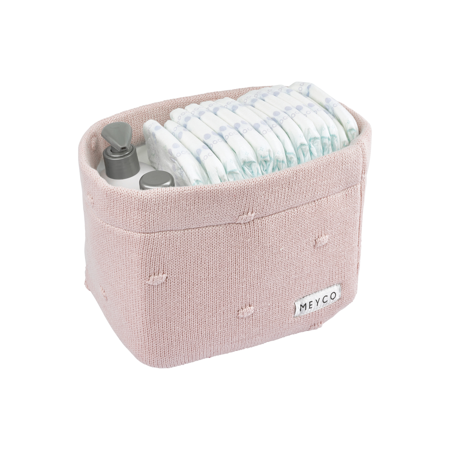 Dettagli del prodotto: Contenitore per tutti i piccoli oggetti Mini bottoni lavorati a maglia Materiale e cura: Materiale: 100% cotone Pulire l'interno con un panno umido Dimensioni e peso: 26 x 19 x 16 cm Incluso nella consegna: 1 x MEYCO Cestino per fasciatoio medium Nodi rosa tenue