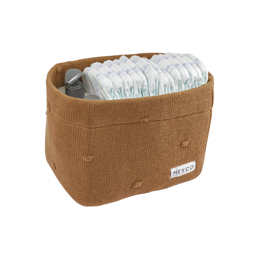 Dettagli del prodotto: Contenitore per tutti i piccoli oggetti Mini bottoni lavorati a maglia Materiale e cura: Materiale: 100% cotone Pulire l'interno con un panno umido Dimensioni e peso: 26 x 19 x 16 cm Incluso nella consegna: 1 x MEYCO Cestino per fasciatoio medium Nodi Toffee