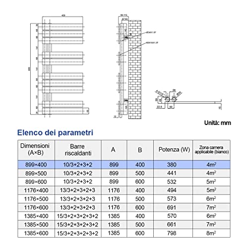 DIMENSIONI DELLO SCALDASALVIETTE: 899 x 400 mm, distanza dalla parete: 99-115 mm, potenza: 380W, area della stanza applicabile: 4m²