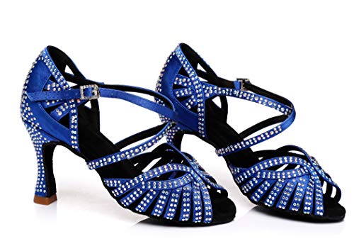 MGM-Joymod Donna Peep Toe Croce Strap Cut-Out Raso Strass Salsa Tango Latino Moderno Matrimonio Ballroom Scarpe da ballo, Tacco blu 9 cm., 40 EU