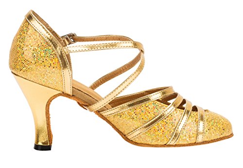 MGM-Joymod - Scarpe da ballo da donna, con punta chiusa, con glitter sintetici, ideali per la sera e la sala da ballo, Oro (Tacco Flash Gold 8cm), 35 EU
