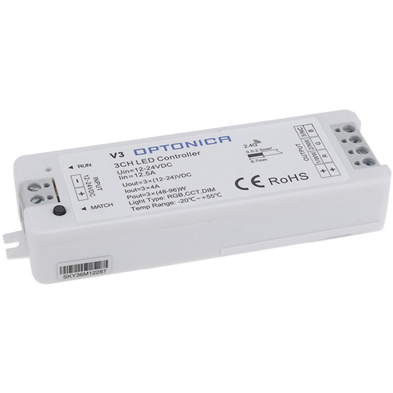Questo controller RGB consente di controllare i punti LED o nastri RGB (scelta colore, passeggiata, stop...). Gamma lunga 30m, max 5A/canale, totale 15A. Tre corsie. Funziona in 12V e 24V. Compatibile con il telecomando AC6374. Indice di protezione IP20. Solo uso interno. Dimensioni 98 x 33 x 18mm. Marca Optonica, 5 anni di garanzia. Funzionalità Marzo/arresto Scelta di un colore fisso 4 modalità di cambio automatico del colore Colore bianco Variazione di intensità (dimmable) - variazione di intensità Questo controller si collega direttamente dopo alimentazione 12 o 24 Volt. L'output è realizzato in cavo RGB (4 fili) e può essere collegato direttamente a RGB o nastro (4 fili). Materiale: Plastica Indice di protezione IP: IP20 Colore: Bianco Altezza: 18 mm Certificazione: CE e ROHS Larghezza: 33 mm Lunghezza: 98 mm Garanzia: 5 anni Disponibilità: Etichetta: SÌ Digitare Posizione: Piccolo