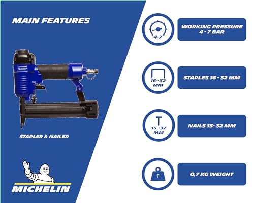 Michelin Graffatrice e Chiodatrice Pneumatica, adatta per Graffe 16-32 mm e Chiodi 15-32 mm, inclusi Occhiali di Sicurezza, Bottiglietta di Olio, Pressione Max 7 Bar