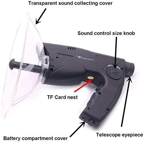 Il suo monoculare integrato è ottimo per avvistare animali da lontano o per osservare i minimi dettagli di animali più piccoli. Per non disturbare l'ambiente circostante, viene fornito con un jack per cuffie da 3,5 mm. L'amplificatore del suono viene fornito anche con un proprio paio di cuffie.