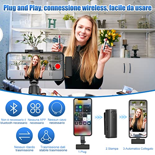 Microfono Wireless Lavalier per iPhone/iOS/Androide, 2,4 GHz Mini Microfono Lapel Senza Fili Smartphone, Tablet, Laptop, per Streaming, YouTube, TikTok, Vlog, Video, Auto Sync, Regali per Uomini Uonne