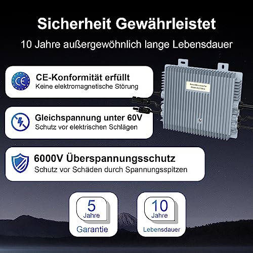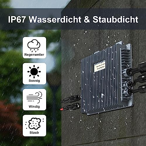 【Impermeabilità IP67】 Fotovoltaico da Balcone Microinverter dispone di una solida protezione della classe di impermeabilità IP67 e offre alla vostra centrale elettrica del balcone la protezione più forte, sia in caso di pioggia forte o in caso di tempesta e sabbia.