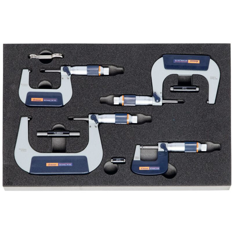 Esecuzione: Assortimenti standard di utensili in alloggiamenti in espanso rigido bicolore in PE. La struttura non porosa dell'espanso è impermeabile e resistente agli oli. Strato superiore color antracite, quello inferiore di contrasto color grigio mette in evidenza gli utensili mancanti. Fornitura: Inserto in espanso rigido vuoto n. art. 952001 Dim. 952095: 1 pz.Micrometro GARANT n. art. 420402 Dim. 0−25;