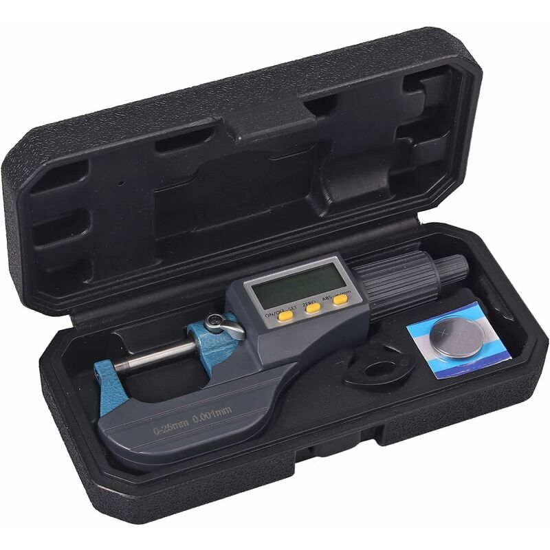 Micrometro elettronico digitale - È uno strumento professionale con misurazioni ultra precise e display LCD chiaro e di facile lettura. È dotato di una chiave di regolazione, un manuale di istruzioni e una batteria di backup anche con un coperchio protettivo. Una varietà di potenti funzioni - Ha la funzione di conversione misura assoluta/relativa, metrica/pollici. Con una risoluzione di 0,001 mm e una precisione di 0,002 mm. Design intelligente - Dopo cinque minuti, lo schermo si spegnerà automaticamente se non viene eseguita alcuna operazione. Con funzione di conservazione e cancellazione dei dati. Dispositivo di misurazione della forza a cricchetto - La ruota di misurazione ausiliaria può misurare costantemente la forza di contatto della sonda per evitare l'errore di pressione. Il mandrino rinforzato e modellato con incudine in metallo duro garantisce durata e precisione. Sonda in acciaio inossidabile trattato durevole - Adotta un trattamento duro in acciaio inossidabile