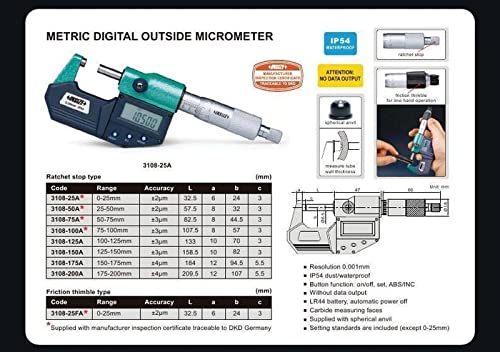 Micrometro tarato INSIZE 3108-25A con Certificato di Taratura Acreditato LAT (accettato da ACCREDIA)