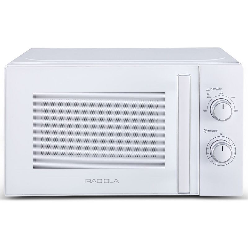 Radiola RAMW20SMW microonde monofunzione. Forno a microonde monofunzione. Potenza microonde: 700 W. Capacità: 20 litri. Connesso: no Cottura a vapore: no. Tipo/i di controllo/i: Meccanico. Controllo manuale, 5 livelli di potenza. Giradischi. Diametro: 25,5 cm. Sistema di apertura della porta: Laterale Funzione di scongelamento. Segnale di fine cottura. Temporizzatore da 35 minuti. Sicurezza dei bambini: no. Natura della cavità: Verniciata. Cavità verniciata in grigio. Colore esterno bianco. Finitura/Diffusore Laccato. Dimensioni (cm) AxLxP 25,8 x 43,95 x 33,5 cm. Peso netto (Kg) 10 kg.