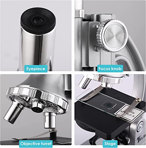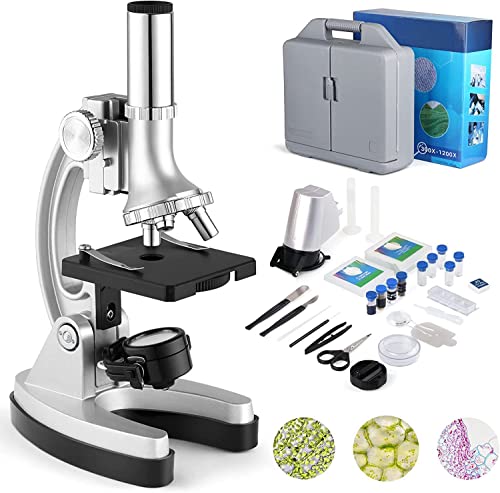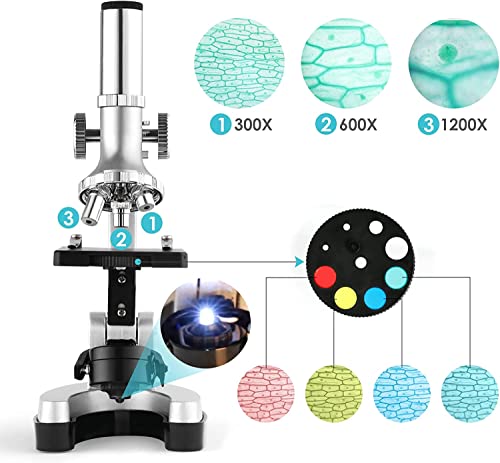 Microscopio 300X-600X-1200X Microscopio Bambini con 70 pezzi + Set di Accessori, Braccio In Metallo, Microscopio per Principianti per Studenti con Luce LED e Scatola per Il Trasporto, Come Regalo
