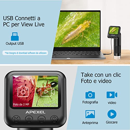 Real Time View, scala/riduzione e immagine di registrazione: la connessione tra il microscopio USB e il PC può vedere chiaramente il mondo micro sullo schermo. Basta premere il pulsante corrispondente sul dispositivo per migliorare/rilasciare. Contiene anche schede SD da 32 GB che possono risparmiare dieci immagini. In particolare zoom/out non può essere utilizzato sul PC. Quando si utilizza il software sul PC, è necessario prima scaricare il software necessario.