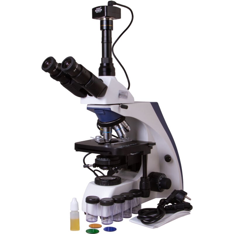 Il microscopio trinoculare Levenhuk MED D30T combina i vantaggi di un modello ottico convenzionale e di un modello ottico digitale. Può essere utilizzato per osservazioni ottiche di microstrutture, nonché per scattare e trasmettere fotografie di campioni e registrare video di ricerca. Questo microscopio è stato progettato per i professionisti in vari campi scientifici. L'uso di ottiche acromatiche semipiatte corrette all'infinito, la possibilità di impostare l'illuminazione Köhler e una fotocamera digitale da 10 MP consentono un uso efficace del Levenhuk MED D30T in un'ampia gamma di compiti. Ottica acromatica sempiatta con correzione all'infinito I microscopi della serie Levenhuk MED 30 sono dotati di un sistema ottico con correzione all'infinito, tipico dei microscopi professionali di alta qualità. Questo sistema comprende lenti semipiatte con correzione all'infinito e permette di ottenere immagini chiare e ad alto contrasto con un alto livello di planarità. Una delle