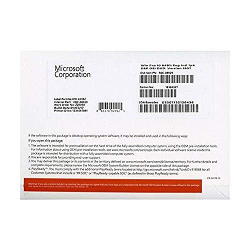 Microsoft Windows 10 PRO - Licenza - 1 Licenza - OEM - Dvd - 64 Bit - Italiano