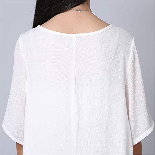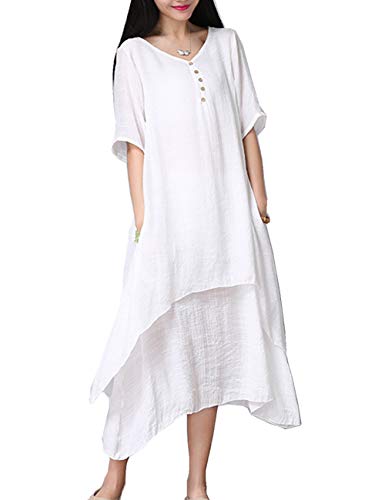 Midi - Vestito casual da donna, tunica, in cotone + lino a mezza manica, tinta unita, morbido, comodo, fresco per l'estate, vita in città e in spiaggia, taglie grandi bianco 40