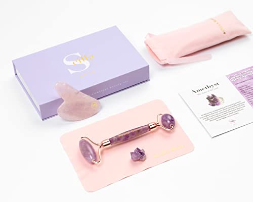 BEAUTY SET DI QUALITÀ - 100% Senza Cigolii, Rotolamento Fluido, Rullo "Ambo i lati" in Quarzo di Ametista Genuino Lussuoso e il miglior Gua Sha in Quarzo di Ametista ATTENZIONE Assicurati di acquistare un vero e proprio Quarzo di Ametista, piuttosto che un vetro o una plastica a buon mercato, che contengono sostanze chimiche dure e possono emettere rumori o cigolii. Il nostro miglior Rullo Quarzo di Ametista include una garanzia a vita dai Cigolii e dai Rumori.