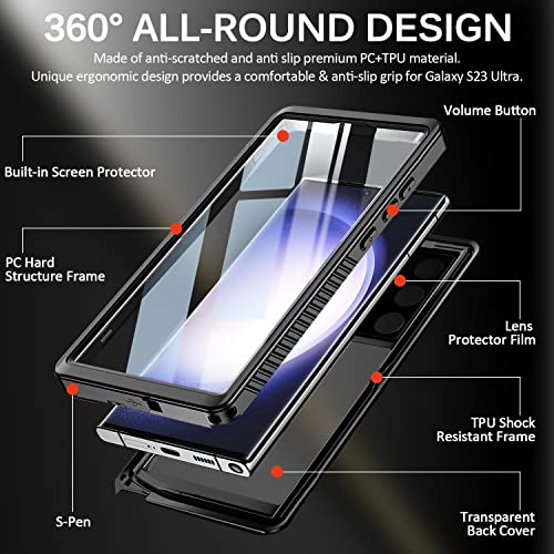 [Protezione completa] Questa custodia è realizzata in PC trasparente + telaio in TPU antiurto + protezione per schermo galss temperato bulitin, che copre completamente il tuo Samsung Galaxy S23 Ultra e aiuta a prevenire danni da collisioni, graffi, usura quotidiana, cadute accidentali e urti. Le cornici elevate sulla cover Galaxy S23 Ultra mantengono il touchscreen e l'obiettivo della fotocamera liberi da superfici dannose.