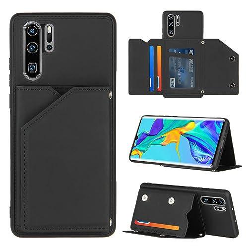 Mikikit Custodia Portafoglio Pelle PU per Huawei P30 PRO, Nero Porta Carte Flip Cover Pelle Custodia Magnetico Bottone Silicone Soft Cordino Borsa Cavalletto Cover Rigida Antiurto per Huawei P30 PRO