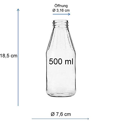 Contenuto della confezione: 12 bottiglie di vetro da 0,5 l con tappo a vite colore argento, 1 imbuto Ø 8 cm