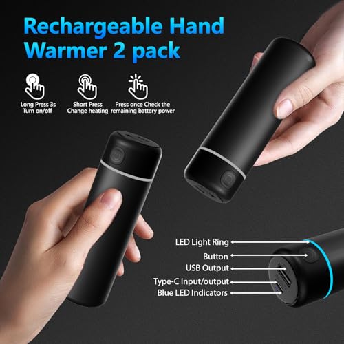 Milduall Scaldamani Ricaricabile, 2pcs 5000mAh Scaldamani Elettrico USB Scaldino Tascabile Powerbank - 3 Modalità di Riscaldamento - Portatile Regalo Inverno per Donna Sport Invernali Attività, Nero
