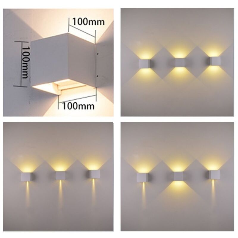 Applique Lampada da parete con luce LED integrata 6W. Design moderno a forma di cubo installato a parete, realizzato in alluminio verniciato, che dona un'illuminazione suggestiva sulla parete, diffondendo il fascio luminoso sia verso l'alto, sia verso il basso, con il valore aggiunto della possibilità di regolare il fascio luminoso sulla parete grazie alle alette interne. Tipo di led: cob led Colore luce: 3000K - 4000K Dimensioni: 10 x 10 x 10cm Corpo: alluminio pressofuso Consumo e sorgente luminosa: 6w Grado di protezione IP: ip65 Fascio luce: regolabile