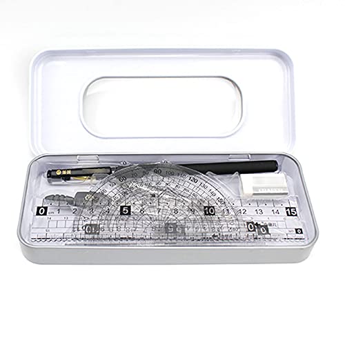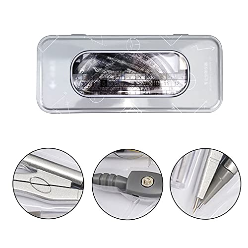 Il kit di bussola include: 1 bussola, 2 righelli triangolari, 1 righello dritto, 1 penna, 1 goniometro, 1 ricarica per mine per matita, 1 gomma