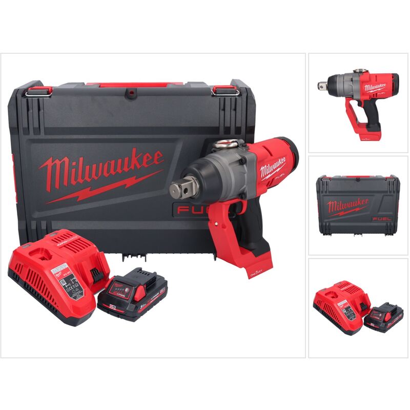Contenuto della consegna: - 1x Milwaukee M18 ONEFHIWF1 18V Avvitatore a impulsi a batteria - 1x Impugnatura laterale - 1x Gancio in metallo - 1x Milwaukee M18 HB3 ad alta potenza 18 V 3,0 Ah Li-Ion - 1x Caricabatterie rapido universale Milwaukee M12-18 FC - 1 scatola Milwaukee HD Descrizione del prodotto: L'avvitatore a percussione a batteria Milwaukee M18 ONEFHIWF1 18V è il primo avvitatore a percussione a 18 volt da 1 pollice al mondo, progettato per sostituire gli scalpelli a filo, a benzina o pneumatici. Con una coppia massima di 2033 Nm, ha un peso e dimensioni dimezzate rispetto ad altri utensili analoghi, il che lo rende particolarmente maneggevole. Con una coppia impressionante fino a 2400 Nm, l'avvitatore a impulsi a batteria da 1 pollice può facilmente svitare viti fino a M42. La funzione DRIVE CONTROL consente di passare da 4 diverse velocità con diverse impostazioni di velocità e coppia per garantire un'ampia gamma di applicazioni. Il controllo integrato della corsa