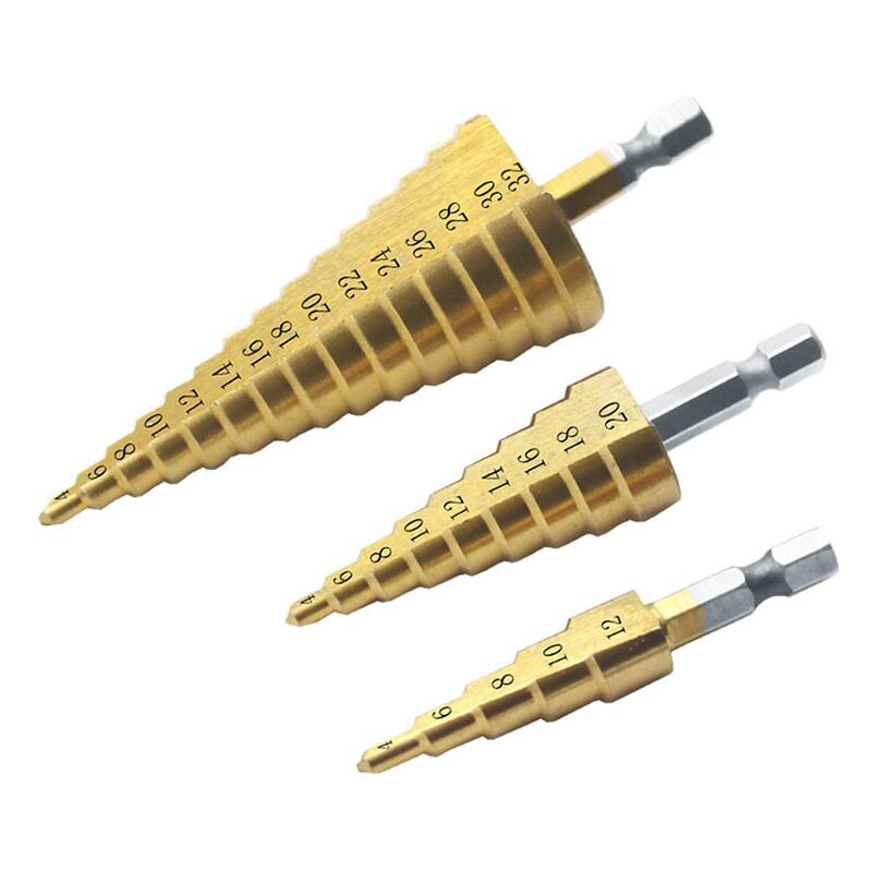 Materiale: acciaio rapido 4241 (adatto per parti con una durezza inferiore a 25°, come l'acciaio al carbonio Specifiche: 4-12 mm (5 fasi: 4, 6, 8, 10, 12 mm) 4-20 mm (9 passi: 4, 6, 8, 10, 12, 14, 16, 18, 20 mm) < p>4-32 mm (passo 15: 4, 6, 8, 10, 12, 14, 16, 18, 20, 22, 24, 26, 28, 30, 32 mm) Trattamento superficiale: titanio placcatura