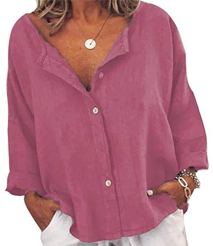 Minetom Camicetta Donna Elegante Top a Manica 3/4 Colletto Tinta Unita Camicie Camicia in Lino di Cotone B Rosa 44