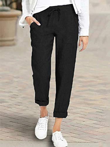 Minetom Donna Pantaloni Cotone Estivi Lino Pantaloni Spiaggia Morbidi Confortevoli Pantaloni Casual Larghi Tinta Unita con Coulisse 7/8 Lunghezza A Nero XS