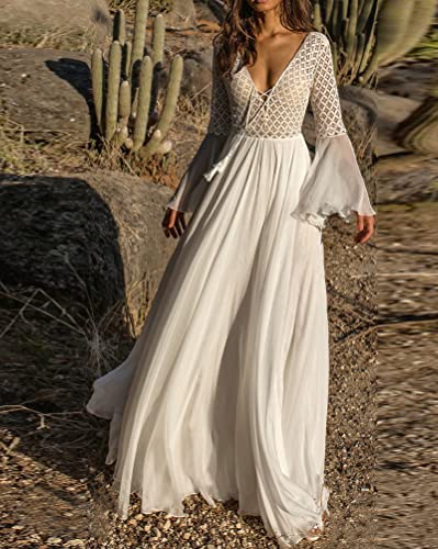 Minetom Donna Scollo V Maniche Lunghe Abiti Eleganti Vestito Lungo Ampio Pizzo Maxi Abito da Spiaggia Festa Sera A Bianco M