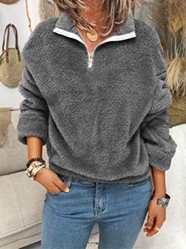 Minetom Felpe Senza Cappuccio Donna Pullover Tops Termico A Manica Lunga Maglione Donna con Zip Risvolto Flanella Caldo Ragazza Invernale Grigio S