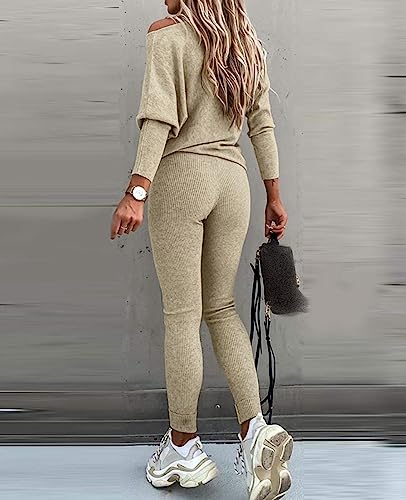Minetom Tuta da Ginnastica Donna Una Spalla Tute Pullover Maglione + Pantaloni Set Training Sportivo a Maglia Completo Sportswear 2 Pezzi A Beige 38