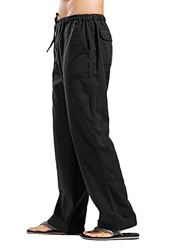 Minetom Uomo Pantaloni Larghi Estate Casual Baggy Leggero Traspirante Tinta Unita Ampio Lino Lungo Pantaloni con Coulisse Tasche A Nero 5XL