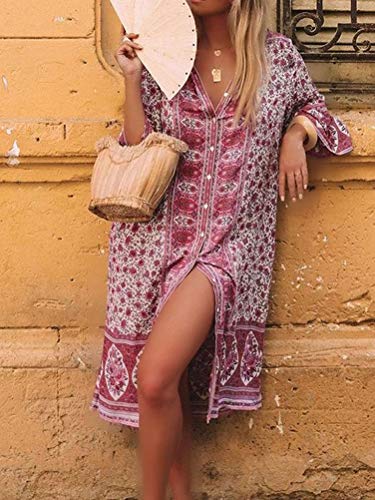 Minetom Vestito Donna Estivo Scollo A V Manica Corta Abiti da Spiaggia Vestiti Spiaggia Ragazza Loose Floral Abito Cocktail B Rosa XXL