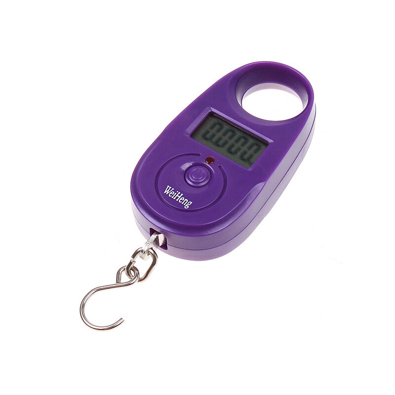 25kg * 5g Mini display digitale viola Appeso bagaglio Pesca Bilancia KG LB Caratteristiche: Design ultracompatto e peso leggero. />Capacità di 25 kg con leggibilità di 5 g. Ottima qualità e peso preciso. Funzioni stabili e display digitale. 3 unità selezionabili: kg, lb, jin Spegnimento automatico dopo 2 minuti o spegnimento manuale all'istante. Con un gancio di ferro, per appendere i bagagli. Facile per portarlo in tasca o in borsa per pesare in viaggio. Specifiche: Colore: viola Capacità e amp;
