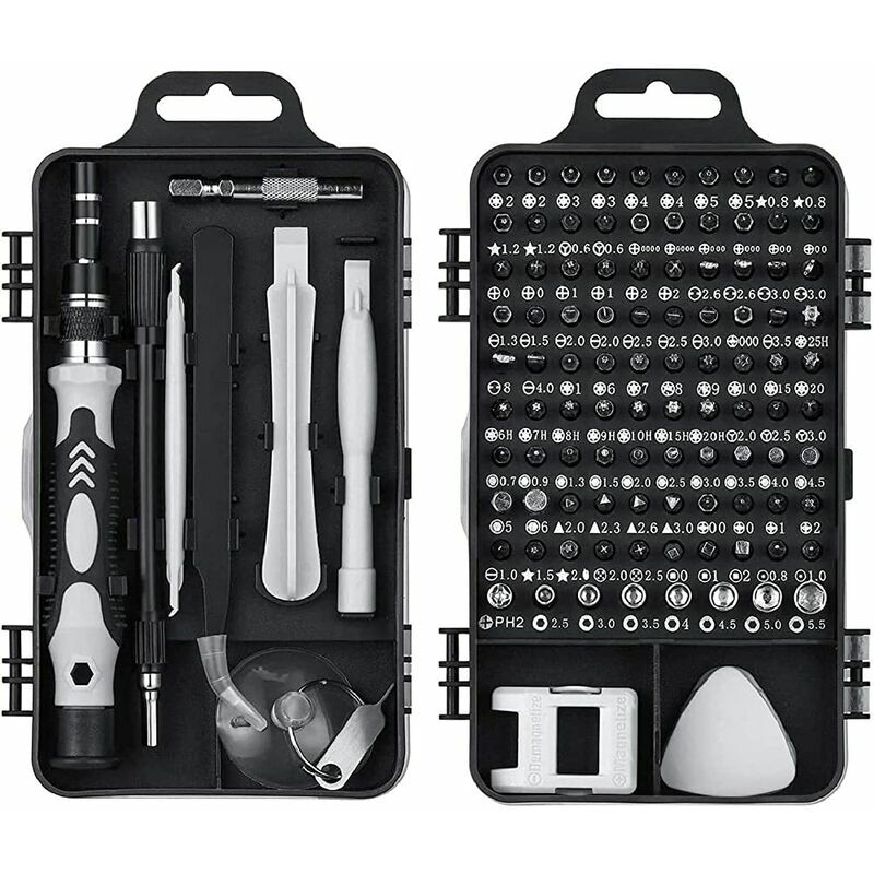 Kit di cacciaviti di precisione di 117 strumenti in 1 set di strumenti di riparazione per cacciaviti per smartphone, laptop, orologi, gioielli, giocattoli, iPhone, occhiali, ecc. . Include 98 punte per cacciavite, 1 impugnatura per cacciavite, 1 asta di prolunga in lega di alluminio, 1 asta di prolunga, 1 adattatore per trapano elettrico, 1 pinzetta, 3 piede di porco, 1 magnetizzatore/smagnetizzatore, 8 leve triangolari, 1 ventosa, 1 pin per iPhone. . La testa in cromo vanadio ha una durezza di 55-60HRC. La testa del kit di cacciaviti è magnetica, con buona garanzia di qualità e operatività. ....
