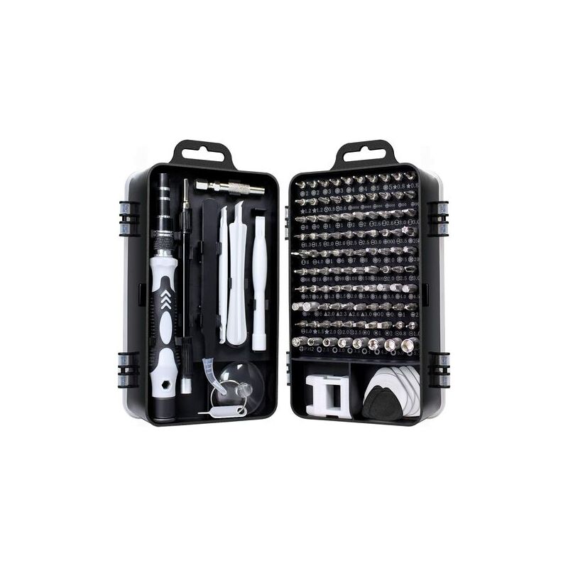 Vari usi Set di cacciaviti Torx multi kit 115 in 1 Il set di cacciaviti di precisione può essere utilizzato per elettrodomestici come TV, condizionatori d'aria, ventilatori, macbook, frigoriferi e riparazioni di auto. Può essere utilizzato anche per lo smontaggio e la manutenzione di telefoni cellulari, fotocamere digitali per occhiali da PC, orologi ps4 iPhone6/7/8plus, laptop e console di gioco. Il kit di strumenti di riparazione è dotato di una scatola di immagazzinaggio in PP resistente agli urti. Lo spazio di archiviazione è ben progettato, le loro posizioni e le dimensioni degli accessori sono coerenti e le parti non saranno facili da perdere. Una vasta gamma di accessori per i tuoi lavori. Set Mini set di cacciaviti ha estensioni morbide e rigide per luoghi ristretti. È inoltre dotato di morsetti antistatici e impugnature in silicone antiscivolo per tutti i tipi di utilizzo. La qualità dell'hardware Gu Professional è garantita) La testa al cromo vanadio ha una durezza di 55-60