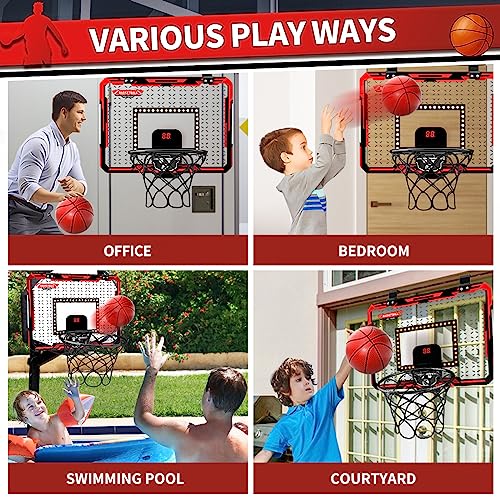【Canestro da basket con luci potenziate】Incoraggia l'amore dei bambini per il gioco del mini canestro da basket per cameretta con l'emozione di una palestra affollata che applaude i loro successi! Il punteggio sarà calcolato digitalmente e visualizzato automaticamente. mini Lights Scoring basketball hoop for door.