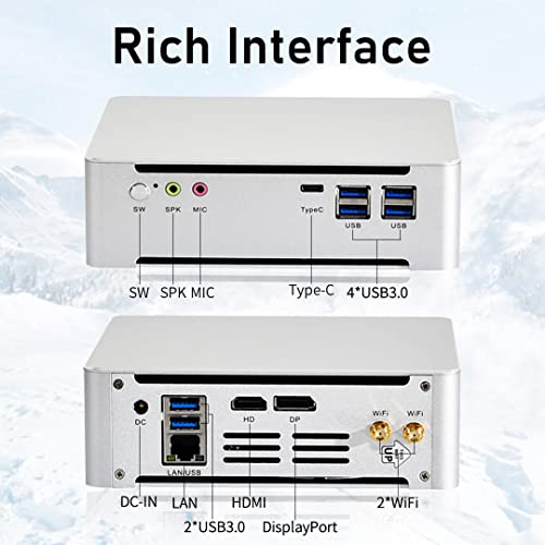 Eseguire senza problemi: questo mini computer adotta la progettazione completa della cassa del metallo. La custodia in metallo aiuta il computer a dissipare il calore in modo efficiente. L'efficiente ventola mantiene il computer fresco e funziona senza problemi. La RAM DDR4 supporta fino a 64GB (32GB*2) e l'archiviazione supporta doppio SSD M2 2280 NVME. L'altro connettore M2 è dietro la scheda madre.