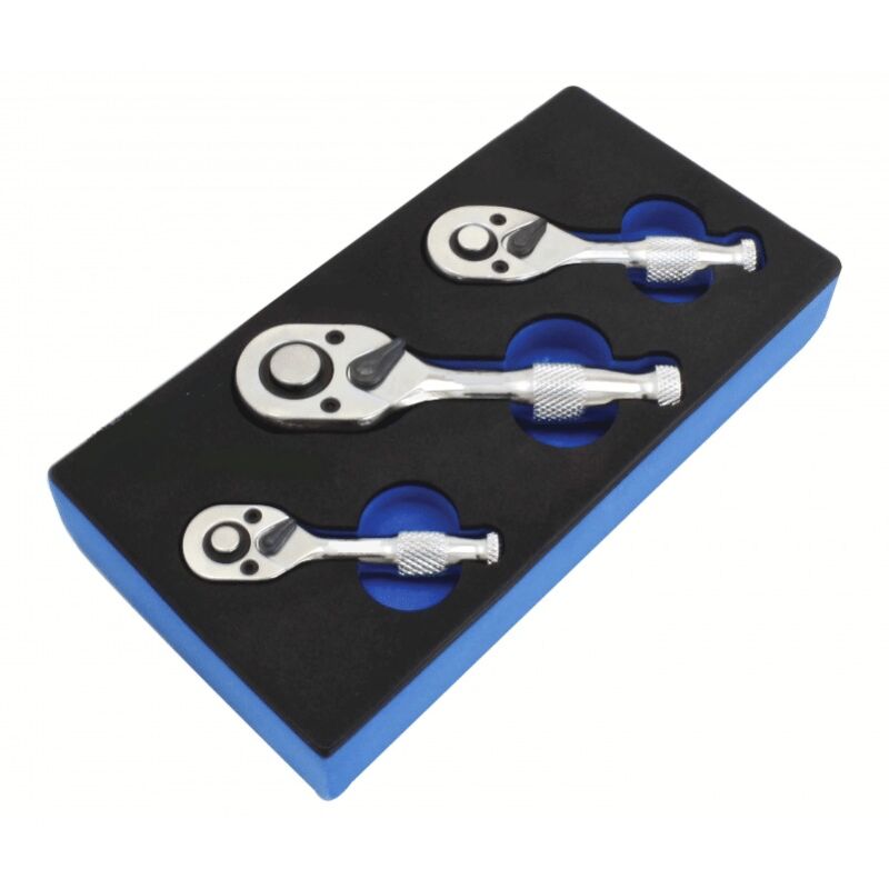 SET 3 MINI CRICCHETTI NANI 1/2 3/8 1/4 CRICCHETTO NANO 72 DENTI 72S sa Set di chiavi a cricchetto con impugnatura corta e funzione di sgancio rapido Piccole dimensioni e funzionalità consentono di lavorare in spazi molto ristretti Le chiavi a cricchetto di piccole dimensioni vengono utilizzate, tra l'altro, nella rimozione di piccole viti, mobili ed elettrodomestici e nella riparazione di auto, moto e veicoli elettrici Costruzione in acciaio al cromo vanadio lucido Meccanismo a cricchetto a 72 denti Pulsante di sgancio rapido Viene fornito con una modanatura in schiuma resistente Impugnature scanalate per evitare che la mano dell'operatore scivoli