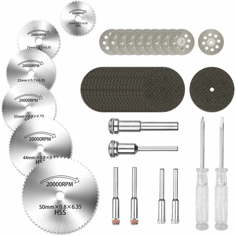 , 6 dischi da taglio HSS con gambo da 1 1/4'' e 1 1/8'' asta, 20 dischi da taglio in resina incastrati in 2 pezzi. Dorsi da 1/8'', 2 pz. Cacciavite. 【Qualità Premium】 Questo mini disco da taglio diamantato realizzato in acciaio ad alta velocità, particelle di diamante e fibra di vetro è resistente e durevole. Le lame della sega sono ben pre-oliate, il che dovrebbe avere un effetto positivo sulla durata. 【Facile da installare】 Questo set di lame per seghe circolari è facile da installare e facile da installare e sostituire. Il fatto che una freccia sia sul bersaglio indica la direzione del movimento - questo evita il rischio di lesioni. 【Uso versatile】 Queste ruote da taglio con lame HSS Strumento di tornitura compatibile adatto per legno, plastica, fibra di vetro, pietra, rame, alluminio e lamiera sottile. I dischi da