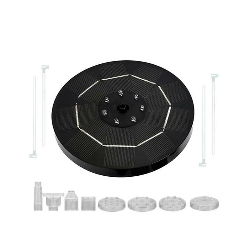 Mini fontana d'acqua solare piscina fontana a cascata decorazione del giardino bagno per uccelli all'aperto cortile galleggiante ad energia solare Descrizione: Tensione del pannello solare: 4.5V Potenza del pannello solare: 3.5W Dimensioni del pannello solare: diametro 160mm Numero di LED: 7 luci colorate a LED (ciclo colorato) Tensione della pompa dell'acqua: DC 4.5V Potenza della pompa: 1.0W Sollevamento massimo: 130cm Portata massima: 240L/H Altezza spruzzi d'acqua: 60CM Batteria: 3.7V 1800mAh Cornici E Articoli Da Esposizione lista: Fontana x1 Ugello x6 Ugello di base x1 Adattatore x1 Asta di supporto x4 Manuale x1 Specifiche tecniche: Incastoneciabatta ad acqua solare a LED a colori cigliaecieciabatte a fontana solare è dotata di 7 luci a LED, diversi colori. La corsa automatica del ciclo a colori rende le viste notturne più belle. Viene fornito con batteria, sarà completamente caricato durante la giornata di sole e può funzionare dopo il tramonto fino a 6 ore. Buona decorazione