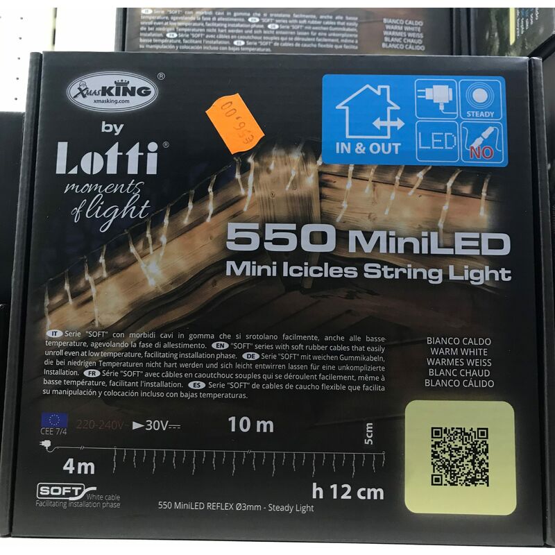 LOTTI 550 Mini LED Mini Icicles StringLight Bianco CaldoSerie soft con morbidi cavi in gomma che si srotolano facilmente, anche alle basse temperature, agevolando la fase di allestimento. dim. 4+10m Uso interno ed esterno Caratteristiche tecniche Accessori in Dotazione