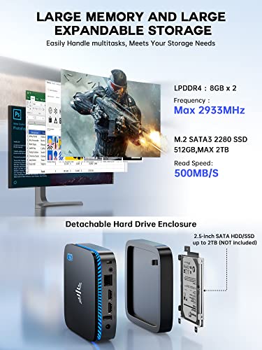 【Memoria più ampia + spazio di archiviazione espandibile】 RAM LPDDR4 integrata da 16 GB, SSD SATA M.2 da 512 GB (supporta fino a 2 TB di SSD M.2 SATA3 SSD 2280/2,5 pollici SATA3 HDD, non incluso). Supporta l'espansione del disco rigido esterno, fai da te 2.5 SSD/HDD da pollici (NON INCLUSO) nella base vuota rimovibile per espandere lo spazio di archiviazione fino a 2 TB. Passa facilmente avanti e indietro tra più applicazioni.