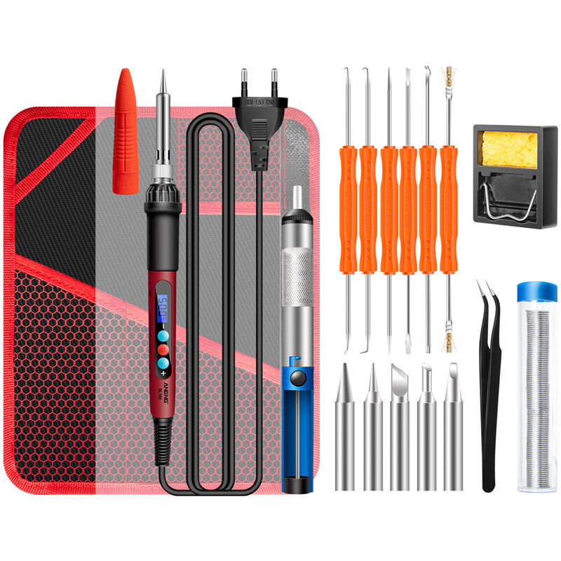 Con caratteristiche portatili e sostituibili con la punta, questo set di saldatori elettrici compatto e leggero è pratico e comodo da usare. Con una comoda maniglia di controllo e una semplice interfaccia di controllo, è efficace per migliorare l'efficienza operativa, che può essere uno strumento perfetto per ingegneri elettronici e appassionati di manutenzione elettronica. Caratteristiche: Con un design del circuito di sicurezza e realizzato con materiali metallici, ABS e PC selezionati, con presa comoda e resistenza alle scottature e resistenza allo scivolamento e prevenzione elettrostatica e resistenza all'usura e lunga durata. Con un nucleo riscaldante in ceramica interno di qualità, supporta il controllo intelligente della temperatura tra 180 ℃ ~ 500 ℃ (356 ℉ ~ 932 ℉), ottenendo un riscaldamento istantaneo, stabile e sicuro. Dotato di display LCD chiaro con retroilluminazione luminosa, comodo da usare e facile da leggere la temperatura. Adotta il chip del termostato aggiornato e