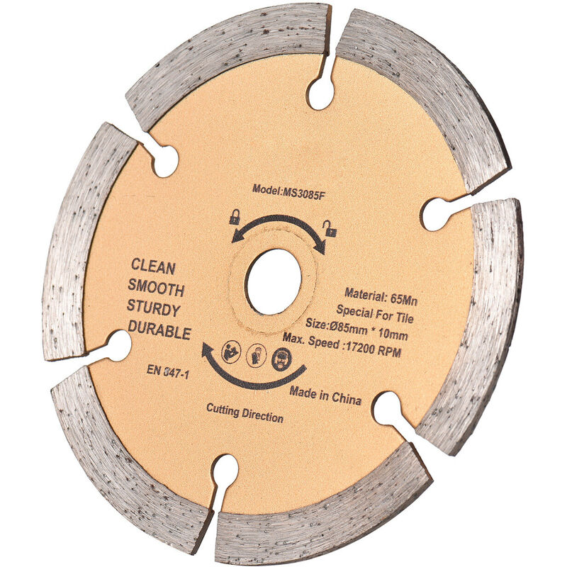 Specifiche: Materiale: acciaio al manganese e diamante Denti in metallo duro: bordo continuo Dimensione albero: 3/8in (9,5 mm) Diametro: 3-3/8 pollici (85 mm) Peso articolo: 49 g / 1,73 once Peso confezione: 71 g / 2,53 once Dimensioni del pacchetto: 9 * 9 * 0,5 cm / 3,54 * 3,54 * 0,20 pollici Elenco dei pacchetti: 1 * Lama diamantata da 3-3/8 pollici (85 mm).