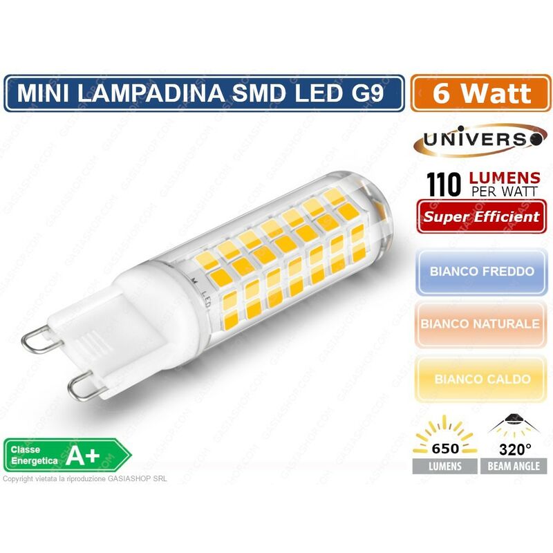 Universo lampadina LED da 6W di potenza con attacco G9 e tecnologia LED SMD . La sua forma tubolare è realizzata in materiale plastico e la sua copertura è trasparente . Con fascio luminoso di 300° e flusso luminoso fino a 680 lm, questa lampadina ad alta luminosità ha un rapporto fino a 113 lm/W . I suoi 6W corrispondono a circa 68W di una tradizionale lampada ad incandescenza. SPECIFICHE TECNICHE • Attacco: G9 • Potenza: 6W • Tensione: AC 220-240V 50/60Hz • Fascio luminoso: 300° • Flusso luminoso: fino a 680 lm • Efficienza luminosa: fino a 113 lm/W • Materiale: plastica • Copertura: trasparente • Dimensioni: Ø 19 x 64 mm • Durata: 20.000 ore VARIANTI DISPONIBILI • Temperatura colore: 3000K (Bianca Calda) - 680 lm - mod. SPARAC-G9-6W-CE2-3 • Temperatura colore: 4000K (Bianca Naturale) - 680 lm - mod. SPARAC-G9-6W-CE2-4 • Temperatura colore: 6500K (Bianca Fredda) - 680 lm - mod. SPARAC-G9-6W-CE2-6 CONTENUTO DELLA CONFEZIONE Lampadina LED Universo tubolare da 6W con attacco G9 e