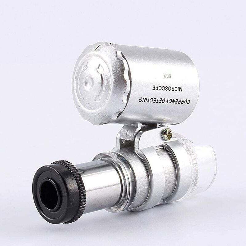 Potente: l'ingrandimento 60x significa che non perderai nemmeno il più piccolo dettaglio. Include custodia in pelle PU per accendere e spegnere le luci. Funzionamento LED con 2 luci - Una luce a LED e una lampada UV illuminano i tuoi oggetti ingranditi. Applicazione: prodotto eccellente per l'industria dell'orologeria, in particolare per l'ispezione di piccoli oggetti come pietre preziose e diamanti, diamanti, monete e francobolli.
