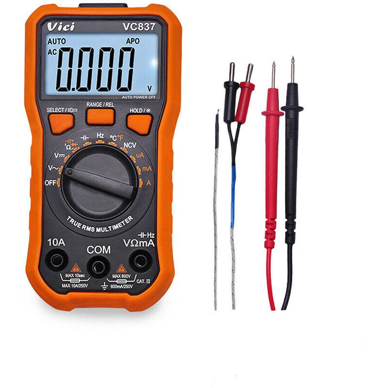 Questo multimetro è progettato per risolvere in modo sicuro e accurato una varietà di problemi elettrici domestici e automobilistici. È dotato di un display LCD con altezza dei caratteri di 28 mm per una lettura chiara. Può essere utilizzato per misurare tensione/corrente CC/CA, resistenza, capacità, frequenza, temperatura, transistor, diodi e duty cycle. Caratteristiche: Max. valore visualizzato: 6000. Ampio schermo LCD: schermo da 51 mm * 28 mm con retroilluminazione per una lettura chiara. Ampio campo di misurazione: può misurare tensione/corrente CC/CA, resistenza, capacità, frequenza, temperatura, transistor, diodo e duty cycle. Intervallo test di temperatura: -40~1000°C / -40~1832°F, conversione unità °C / °F. RMS effettivo, NCV e test del valore relativo: no Contatto tensione con funzione di allarme di avvertimento. Design anti-ustione e antimagnetico: può fornire prestazioni stabili e alta precisione. Torcia a LED: può essere utilizzata comodamente di notte o in un ambiente